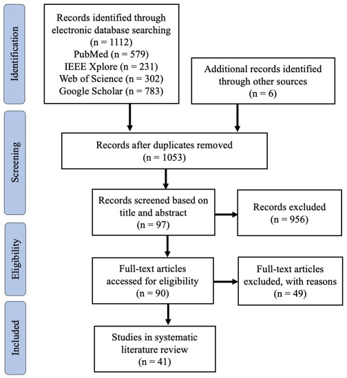 Figure 2 shows the PRISMA flowchart. We identified a total of 1112 studies from three different bibliographic databases, as well as six additional studies from other sources. After removing duplicates, 1053 studies were screened based on their titles and abstracts, resulting in 97 studies for full-text evaluation. Eventually, 41 articles published between 2015 and June 2022 remained for quality assessment. The quality scores for the included studies, ranging from 5.5 to 10 with a mean score of 8.16, are provided in Supplementary Materials. These findings suggest that the studies included in this review are of high quality. Scores for questions 8 and 9 were relatively low, however, indicating that several studies did not conduct adequate comparative analyses. Specifically, 24% of the studies did not perform any comparative analysis, and 48.8% of the studies compared their proposed method to either statistical or ML-based approaches. The results also indicated a slight advantage in scoring for studies utilising implicit approaches compared to those utilising explicit approaches. However, the sample size was relatively small, and subject characteristics were unclear, contributing to bias. A table with extensive details for individual key aspects can be seen in Supplementary Materials.