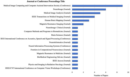 The eligible articles chosen for the study were published across sixteen different journals and three conference proceedings. In total, 29 papers were published in journals, and 12 papers were from conference proceedings. Among these, the Medical Image Computing and Computer Assisted Intervention Society conference proceedings contained the most publications used, comprising 9 out of 41 publications. Following this, six publications from NeuroImage and five from Medical Image Analysis. The publications covered a diverse range of journals, including those in the fields of biomedical engineering, neuroscience, signal processing, and computer science. Figure 3 depicts all the included publishing sources, journals, and conference proceedings.