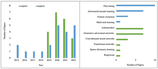 A total of 41 studies were conducted that describe ML being applied to harmonise MRI data in either an explicit (n = 20) or implicit (n = 21) way. The applied ML algorithms were plotted by year, shown in Figure 4. Implicit approaches first appeared in the included studies in 2015, while explicit harmonisation first appeared in 2019. Generally, the number of papers has grown gradually since 2019. Explicit approaches included generative adversarial networks (GANs) (n = 7), autoencoders (n = 7), convolutional neural networks (CNNs) (n = 3), regression (n = 1), transformer networks (n = 1) and sparse dictionary learning (n = 1). Regarding implicit approaches, most of the applications were fine-tuning (n = 10), followed by adversarial transfer learning (n = 7), feature extraction network-based transfer learning (n = 3) and multi-task learning (n = 1). These ML methods are presented in Table 4, along with a brief description and the number of articles for each method.