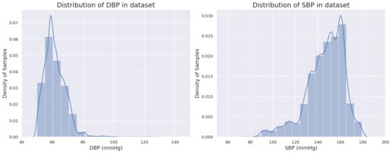 After the above pre-processing steps, 47,964 high-quality PPG signal segments were included in the final experiment. The blood pressure distribution of the final dataset is shown in Figure 1. The first-order derivative velocity plethysmography (VPG) and the second-order derivative acceleration plethysmography (APG) of the PPG signal also contain rich physiological information related to blood pressure []. Thus, the PPG signal and its derivatives were incorporated into the input dataset to enrich the information of the input data. Before being fed into the model, the data should be normalized to make the training process more stable and to increase the convergence speed. In this study, the Min–Max method was adopted to make the amplitude of the PPG signal fall in the [0, 1] interval. The equation is written as follows: