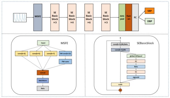 Figure 2 presents the model framework adopted in this study. Given the feature representation capability and the computational cost of the network, ResNet34 was adopted as the basic framework to build the continuous BP estimation model (MSA-ResNet) based on PPG signals. MSA-ResNet provides a simple and effective solution for continuous blood pressure estimation based on a tandem combination of residual structures, combined with multi-scale feature extraction, the channel attention mechanism, and the loss function optimization strategy.