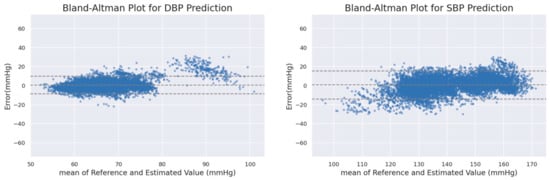 The Association for the Advancement of Medical Instrumentation (AAMI) has established internationally accepted error standards for blood pressure []. The predicted SBP and DBP should have a mean error of less than ±5 mmHg and a standard deviation of less than 8 mmHg. The mean error (ME) and standard deviation (SD) are calculated as shown in Equation (9). However, since the ME and SD are susceptible to outliers, the British Hypertension Society (BHS) has devised an alternative protocol for evaluating BP prediction results using cumulative percentages of errors within the range of 5, 10, and 15 mmHg [].