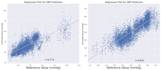 Table 2 shows that the ME of the predicted SBP was 0.92 with a standard deviation of 7.79, while the ME of the predicted DBP reached 0.68 with a standard deviation of 4.94. As depicted in Figure 3, most of the samples lie between the range of the limits of agreement (LOAs) with the 95% confidence interval, suggesting that the predicted blood pressure values were very consistent with the reference values. Furthermore, Figure 4 presents the correlation between the predicted and reference values of blood pressure. The correlation coefficients were 0.773 for SBP and 0.851 for DBP, suggesting that the predicted blood pressure and the reference values showed the same trend and a significant correlation.