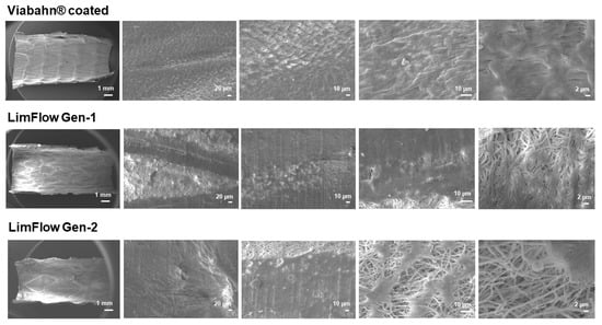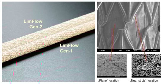 Images of LimFlow stent grafts. Photographic images showing LimFlow Gen-1 and Gen-2 stent grafts (left), and SEM images showing the surface of the LimFlow Gen-2 stent grafts (right).