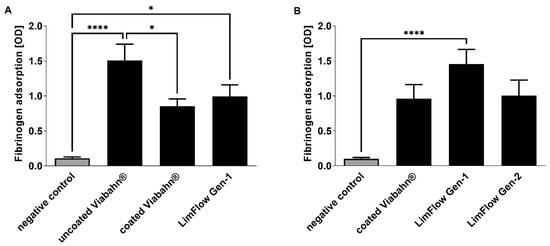 Heparin coating is a well-known technique for modifying the surface of cardiovascular implants and improving the hemocompatibility of devices [,]. Our study confirmed that this technique was efficient when applied to the Viabahn® endoprosthesis and that the heparin-coated Viabahn® performed better than the uncoated Viabahn®. Specifically, less adhesion of fibrinogen to coated Viabahn® was observed compared to uncoated Viabahn®. In addition, the activation of coagulation and platelets was reduced. Overall, these experiments (first (A) and second series (B)) showed that the heparin-coated Viabahn® exhibited better hemocompatibility than the uncoated Viabahn®, as expected. Similarly, the third series of experiments (C) also indicated that the LimFlow Gen-2 performed better than the LimFlow Gen-1 in terms of reduction in coagulation (TAT) and platelet (β-TG) activation and fibrinogen adsorption. Although higher complement activation was observed compared to the negative control, the hemocompatibility of the LimFlow Gen-2 stent grafts was comparable to heparin-coated Viabahn® prosthesis and there were no significant differences. It should also be noted that LimFlow Gen-1 stent grafts covered with electrospun PTFE performed better than uncoated Viabahn®.