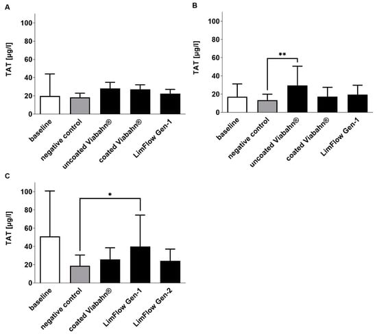 Analysis of TAT concentrations in plasma after the incubation of stent grafts with fresh human blood. (A) Pilot study (n = 3), (B) Experiment series B (n = 8), (C) Experiment series C (n = 7). The data are shown as mean + SD. Statistical analysis was performed using the Friedman test followed by Dunn´s multiple comparison test. N = 8, (* p < 0.05, ** p < 0.01).