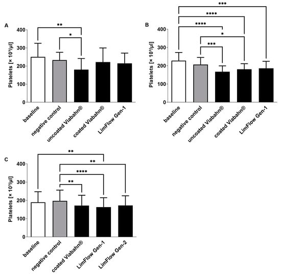 Analysis of platelet counts after the incubation of fresh human blood with test items for 60 min at 37 °C. (A) Pilot study (n = 3), (B) Experiment series B (n = 8), (C) Experiment series C (n = 8). Whole human blood without incubation and contact to test material served as baseline, and blood without test material but incubation as negative control. The data are shown as mean + SD. Statistical differences were determined using one-way ANOVA for repeated measurements followed by Bonferroni’s multiple comparison test. (* p < 0.05, ** p < 0.01, *** p < 0.001, **** p < 0.0001).