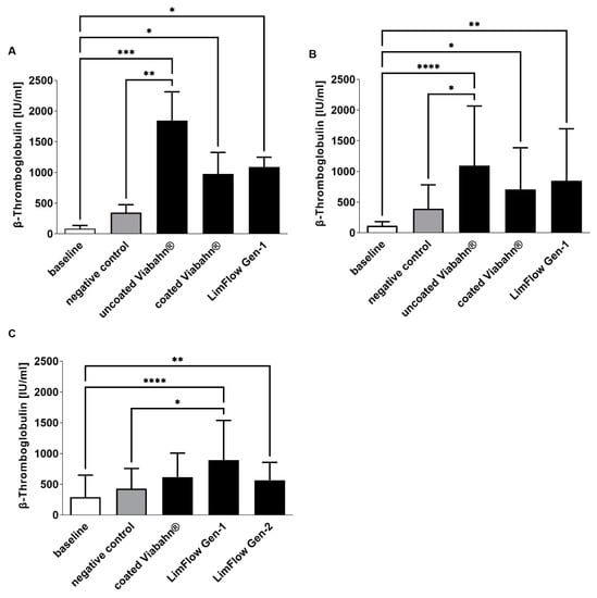 Analysis of platelet activation by measuring β-TG concentration after the incubation of fresh human blood with test items for 60 min at 37 °C. (A) Pilot study (n = 3), Statistical differences were determined using one-way ANOVA for repeated measurements followed by Bonferroni’s multiple comparison test. (B) Study B (n = 8), (C) Study C (n = 8). Statistical analysis was performed using the Friedman test followed by Dunn´s multiple comparison test. Whole human blood without incubation and contact to test material served as baseline and blood without test material, but with incubation as the negative control. The data are shown as mean + SD. (* p < 0.05, ** p < 0.01, *** p < 0.001, **** p < 0.0001).