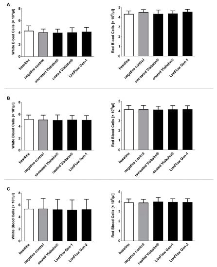 Analysis of white and red blood cell counts after the incubation of fresh human blood with test items for 60 min at 37 °C. (A) Pilot study (n = 3), (B) Study B (n = 8), (C) Study C (n = 8). Whole human blood without incubation and contact to test material served as baseline and blood without test material, but with incubation as the negative control. The data are shown as mean + SD.