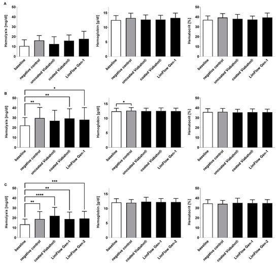 Analysis of hemolysis, hemoglobin, and hematocrit levels after the incubation of fresh human blood with test items for 60 min at 37 °C. (A) Pilot study (n = 3), (B) Study B (n = 8), (C) Study C (n = 8). Whole human blood without incubation and contact to test material served as baseline, and blood without test material, but with incubation as the negative control. The data are shown as mean + SD. Statistical differences were determined using one-way ANOVA for repeated measurements followed by Bonferroni’s multiple comparison test. (* p < 0.05, ** p < 0.01, *** p < 0.001, **** p < 0.0001).