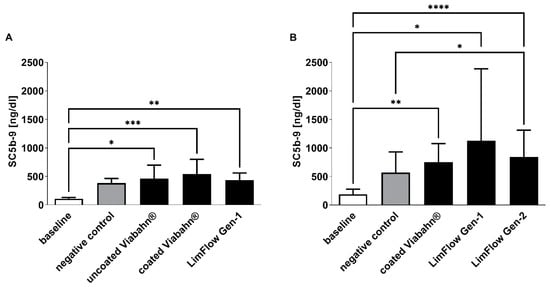 As expected, baseline blood samples showed the lowest concentrations in complement sC5b-9 (108 ± 22 ng/mL and 185 ± 93 ng/mL on average) (Figure 8). The blood circulation in the modified Chandler loop with all test stents significantly increased the complement activation. However, in comparison to the negative control, slightly higher complement activation was detected only after the incubation of blood with LimFlow Gen 2 stent graft (Figure 8B).