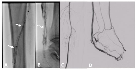 Clinical example of a patient treated at University Hospital Tuebingen with percutaneous deep venous arterialization (pDVA). The aim of this intervention is the redistribution of arterial blood to the foot via the tibial veins as a conduit. (A) Implantation of a dedicated tapered LimFlow endograft for crossing from the posterior tibial artery to a tibial vein (white arrows). (B) Straight LimFlow endografts in the tibial vein covering side branches until the foot (dotted arrow). (C) Angiographic of the proximal lower leg image after implantation of the LimFlow endografts. (D) Final angiographic result of the arterialized venous foot arch after successful pDVA.