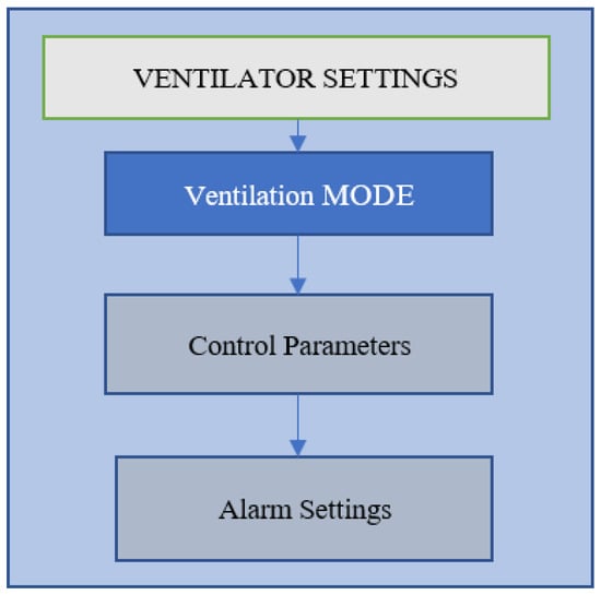 One of the most important treatments routinely used in patients with respiratory conditions or disorders is mechanical ventilation (MV). It is a complicated form of therapy that requires quick and precise decision-making. A sub-optimal mechanical ventilation strategy has a chance of creating ventilator-induced lung injury (VILI). The sub-optimality of an individualized ventilation strategy also leads to an increased ICU stay, a higher cost of ventilation, and an elevated risk of death in patients. The complete optimization of the MV process is mainly dependent on three factors: appropriate mode selection, appropriate control parameter settings and alarm settings, as shown in Figure 1. Most clinicians try to avoid intubating patients and prefer to support the patient by the non-invasive ventilation method. However, if the situation is very critical (blocked airways), intubating the patient is necessary. After intubation, the first step is to select an appropriate ventilation mode. Thus, ventilation mode is one of the most important ventilator settings []. The ventilator interprets the user’s instructions and then produces a series of breaths with the right volume, flow and pressure of air and oxygen. A selection of preconfigured breath types and sequences are determined by a certain VM setting. Each mode has a set of intended applications. The main characteristics of defined mechanical breaths are determined by control parameter choices.