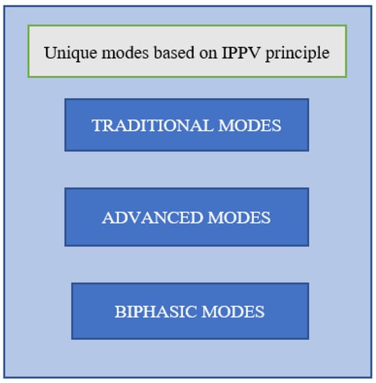 Although there are 174 distinct mode names due to non-standardized mode nomenclature, all current ventilators have one thing in common: they are based on intermittent positive pressure ventilation (IPPV). The IPPV principle can be conceptualized as a series of forced mechanical breaths supplied by a ventilator system []. Based on the IPPV principle, all modes of ventilation fall mainly into one of these three categories, as shown in Figure 2. The first category is that of traditional modes. It consists of eight unique modes based on various parameters. The second category belongs to advanced modes that are the results of consistent growth in technology. In the third category, biphasic modes are included. They supply ventilation breaths by adjusting the positive end-expiratory pressure (PEEP) in a consistent time pattern. Traditional modes are uncomplicated and the most advantageous for real-time applications. These modes are available on the vast majority of mechanical ventilators. Advanced modes and traditional modes have similar breath types. Yet, advanced modes have much more complicated controlling algorithms. They mainly improve treatment quality and decrease the clinical workload. They automate the process of mode adjustment as per the patient’s respiratory needs. They are present in some modern mechanical ventilators. Biphasic mechanisms underpin biphasic modes. The biphasic mechanism is an expansion of the mechanism that generates PEEP. Mechanical breaths can also be generated by the PEEP-generating mechanism [].