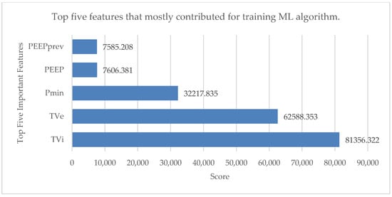 Preprocessing the data is essential to the development of ML models. The monitoring and therapeutic technologies used in critical care units (such as mechanical ventilators) continuously produce significant amounts of data, making these settings particularly data-rich. The most pertinent data attributes are chosen rather than using the entire set of data to create the model. A feature selection test was performed to get the top five features that contributed significantly to the training of the ML algorithm. This small subset of features from the available dataset is significant for the analysis []. The results are shown in Figure 3 with the help of a horizontal bar chart.