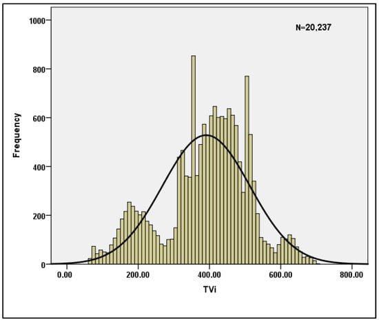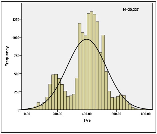 Table 3 shows the descriptive statistics for the per breath data when n = 20,237 is used. The skewness and Kurtosis values shown in the table clearly indicate that the data are normal, and hence the data are suitable for machine learning models. Table 4 displays the reliability statistics, with a Cronbach’s Alpha score of 0.787 indicating that the data are reliable. With a conditional probability value of 0, the Hotelling’s T-squared test is statistically significant. Furthermore, for the sample characteristics TVi and TVe, the normality of the data is plotted and shown in Figure 4 and Figure 5.