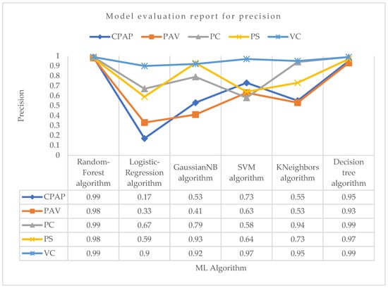 Using the precision parameter shown in Figure 6 for PC mode, the Random-Forest and Decision-Tree algorithms achieved the highest precision of 0.99. Aside from these two techniques, the KNeighbors algorithm had the second-highest precision in predicting PC mode. Other algorithms did not perform well compared with them. Again, the Random-Forest and Decision-Tree algorithms achieved the maximum precision in VC mode, which was around 0.99. The support vector machine algorithm achieved the second-highest precision, which was around 0.97. KNeighbors performed well, although it was not the most accurate in predicting VC mode. For PS mode, the highest precision was obtained by the Random-Forest algorithm, which was about 0.98. The Decision-Tree was the second highest and GaussianNB was the third most precise in correctly predicting PS mode, with precision values of about 0.97 and 0.93, respectively. The Random-Forest method achieved the highest precision in PAV mode, at roughly 0.98, followed by the Decision-Tree technique, at 0.93. With a precision score of 0.99 for CPAP mode, Random-Forest was the most successful method. With the least precision value of 0.17 in predicting CPAP mode, the logistic regression did not perform well.