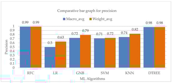 The macro and weighted average of the accuracy values of the various machine learning techniques is shown in Figure 7, which also demonstrates a considerable contribution of the Random-Forest and Decision-Tree algorithms to the overall precision of the entire class.