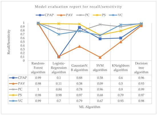 Model evaluation report of recall/sensitivity for different modes and ML algorithms.