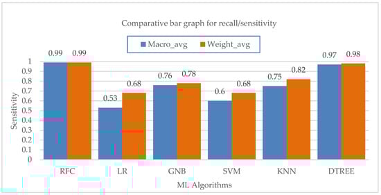 Bar chart visualization of sensitivity comparison among different ML algorithms.