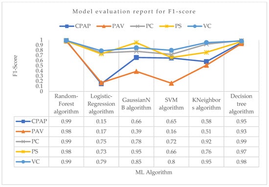 Figure 9 shows the average values for the sensitivity of different machine learning algorithms at the macro and weighted levels. The Random-Forest and Decision-Tree algorithms both have a major impact on the overall sensitivity of the class. Lastly, considering the F1 score parameter for PC mode as shown in Figure 10, the Random-Forest and Decision-Tree algorithms had the highest F1 score of about 0.99. For VC mode, the Random-Forest algorithm had the highest F1 score of about 0.99, followed by the Decision-Tree algorithm with an F1 score value of 0.98. For PS mode, the Random-Forest algorithm had the highest F1 score value of about 0.98, followed by the Decision-Tree algorithm with a score of 0.97. For PAV mode, the Random-Forest algorithm had the highest F1 score of 0.98, followed by the Decision-Tree algorithm with an F1 score of 0.93. The rest of the algorithms did not perform well in terms of F1 score in correctly predicting PAV mode. Lastly, for CPAP mode, the highest F1 score was achieved by the Random-Forest algorithm with a value of 0.99, followed by the Decision-Tree algorithm with a value of 0.95. The logistic regression did not perform well in correctly predicting CPAP mode with the least F1 score value of 0.15.