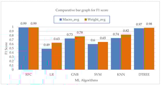 The macro and weighted average values of the F1 score for various machine learning algorithms are shown in Figure 11. The KNN method is followed by the Random-Forest and Decision-Tree algorithms in terms of their effects on the class’s total F1-score. According to performance statistics, the bar chart visualization and a comparison analysis, it is clear that the Decision-Tree and Random-Forest algorithms are the most effective in accurately predicting all five modes with substantial and high values of precision, recall and F1 score. The accuracy values of each ML algorithm are shown in Table 13. Figure 12 shows a bar chart representation of the various accuracy levels attained by several ML algorithms employed in per-breath prediction modes.