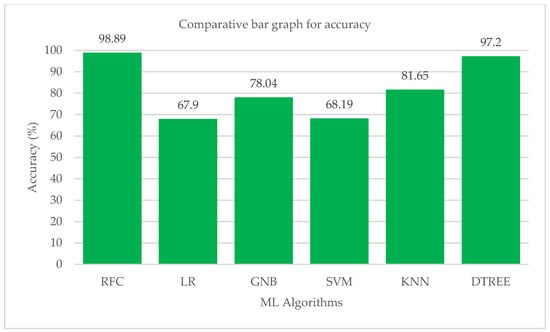 Bar chart visualization of accuracy comparison among different ML algorithms.
