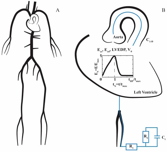- Segers, P.; Stergiopulos, N.; Westerhof, N. Relation of Effective Arterial Elastance to Arterial System Properties. Am. J. Physiol. Heart Circ. Physiol. 2002, 282, H1041–H1046. [Google Scholar] [CrossRef]