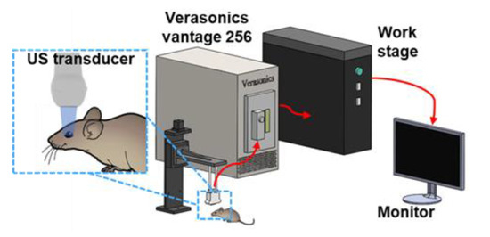 Figure 1 shows our experimental setup for microvessel imaging of the OCM. A L22-14v linear array transducer (Verasonics Inc, Kirkland, WA, USA) with a center frequency at 18 MHz connected to a high-frequency Verasonics Vantage system (Vantage 256, Verasonics Inc., Kirkland, WA, USA) was used to multi-channel transmit waveform generation, analog signal amplification and filtering, and digital signal processing. In order to facilitate the ROI imaging, the transducer was stabilized on a three-axis stepper motorized stage with a minimum step size of 5 µm in each displacement axis. A 7-angle (−18° to 18° with a step size of 6°) compounding plane wave with the post-compounding ultrasound frame rate of 500 Hz was used to boost the contrast and ultrafast data acquisition in favor of super resolution microvessel image processing. A total of 2000 ensembles were collected, corresponding to 4 s with one bolus injection. Next, 10 V transmit voltage was selected as the most suitable voltage for MB visualization. All Time Gain Compensation (TGC) options were kept the same for all acquisitions.