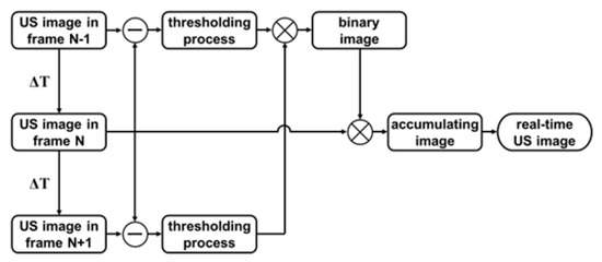 Figure 2 summarizes the key processing steps for the three-frame difference algorithm. Firstly, the latest seven consecutive beamformed in-phase quadrature-phase (IQ) data extracted from buffer were dealt with the absolute value approach to generate US images. These images were divided into five groups, each of which was composed of three adjacent images (N − 1, N, N + 1). In each group, two result frames containing the MB signals were then achieved via subtraction of immediately adjacent frames, while only the signals in both results that had undergone threshold processing could be retained. When the MB signals propagated through a pixel, the pixel value in binary image was set to 1 and the one-frame US image of MBs was obtained by multiplying the binary image and the US image in fame N. Finally, the real-time US image was constructed by accumulating 5 multiplied results.