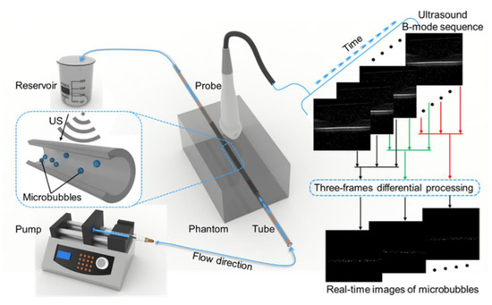 Schematic diagram of the ULM for imaging the phantom. The right side of the diagram shows the reconstructed phantom US images and the real-time MB images processed by the three-frame difference algorithm.