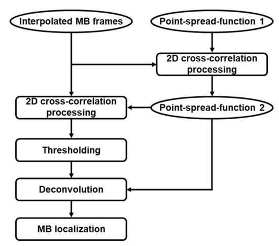 ULM reconstructs the super-resolution image of the microvasculature by accumulating the centroid position of intravascular isolated MBs. One of the essential aspects is the capacity to detect the centroid of MBs with high accuracy in a finer grid [39]. Nonetheless, in most previous publications regarding super-resolution imaging, the intensity peak of MB signals was directly used to define its centroid position, which might lead to hundreds of micrometers in error [40]. Additionally, in the theory of US imaging, the image is considered to be a convolution of the system PSF with a point source. Hence, utilizing the image deconvolution in the MB localization process could be more coincident with the reality.