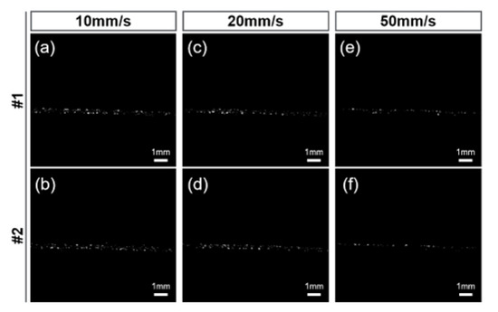 The examples of real-time B-mode imaging with three-frame difference algorithm under different flow velocities. Images at two different moments (#1, #2) were listed for each set of flow velocities. (a,b) 10 mm/s, (c,d) 20 mm/s and (e,f) 50 mm/s.