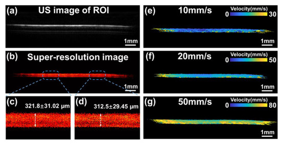Figure 7 displays the US image, super-resolution result image and flow velocity maps of the ROI in the flow phantom. Furthermore, in Figure 7c,d, the calculated average tube diameters at the two locations were 321.8 ± 31.02 µm and 312.5 ± 29.45 µm. These results were consistent with the real tube inner diameter in the vitro experiment, indicating that our algorithm achieved outstanding performance in high-resolution imaging with fewer errors. In order to further investigate whether the super-resolution imaging algorithm could be adapted to a larger range of flow velocity scenarios, we controlled the MBs at flow rates of 10 mm/s, 20 mm/s, and 50 mm/s using a dual-channel syringe pump. As shown in Figure 7e–g, the final reconstructed averaged flow speeds were 9.6 mm/s, 20.5 mm/s, 52.0 mm/s, which is close to the pre-defined velocity.