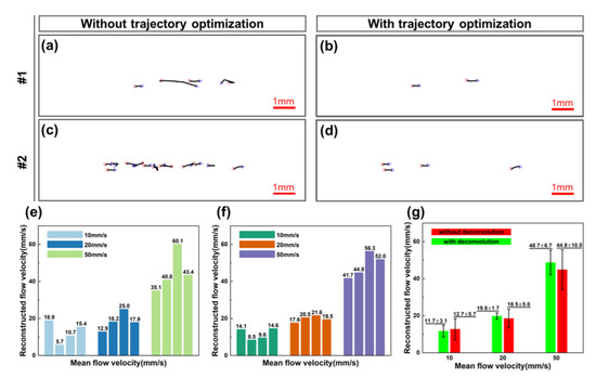 To reveal the importance of the MB movement trajectories optimization step and image deconvolution algorithm for the ULM imaging technique, the comparison results of employing the two proposed methods are shown in Figure 8. Firstly, Figure 8a–d display the MB trajectories (Figure 8a–c) persistently tracked successfully for ten consecutive frames, and the optimized trace (Figure 8b–d) restricted by velocity, direction and acceleration. The remarkable promotion of applying the trajectory optimization step after MB tracking is clearly illustrated in these examples. Without trajectory optimization, numerous inferior trajectories presented features such as excessively long distances or disorganized or reversed paths. Figure 8e–g further manifested the capability of the image deconvolution algorithm in flow velocity calculation. The calculated velocity results of the image deconvolution algorithm were shown in Figure 8f. From these contrasting results, we can see that the calculated mean flow speed is closer to the pre-defined value and less biased after performing the algorithm. With the use of the image deconvolution algorithm, the precision of MB localization improved, and the performance of the ULM further strengthened.