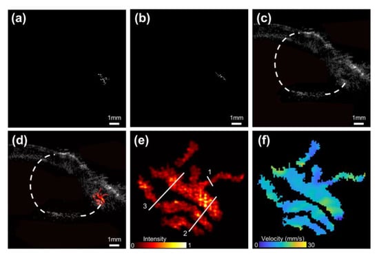 Figure 9a,b show real-time US images after three-frame difference processing at two moments. With the proposed algorithm, we can easily detect whether microvessels and the optimal imaging plane exist in the ROI. Compared with CDI, the US imaging based on the three-frame difference algorithm presents unique advantages in real-time recognition of microvascular location and morphology. In the US image (Figure 9c) of the SD rat ocular region, the eyeball with a diameter of about 6 mm and a heterogeneous echo area of 3.8 mm × 2.4 mm can be observed distinctly. Merely depending on the information provided by conventional US imaging, it is difficult to identify the region with indistinct borders as OCM. Furthermore, its clinical similarity to benign choroidal nevus also greatly limits the early diagnosis of OCM. However, in the corresponding super-resolution microvessel image superimposed on the original US image (Figure 9d), the structure and distribution of the vasculature network are clearly visible in fine scale. The microvessels less than 1 mm in the OCM are clearly indicated in the zoom-in view of super-resolution imaging in Figure 9e. The super-resolution microvessel blood flow speed map was shown in Figure 9f. The estimated averaged velocity was 12.23 mm/s, which fit well with the expected values.