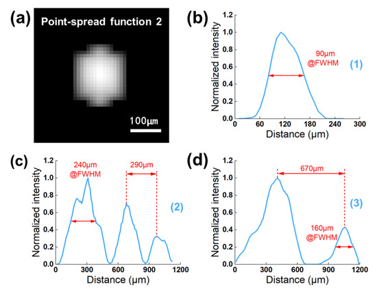 (a) The result image of PSF2 after first performing the 2D cross-correlation method. (b–d) 1D cross-section profiles of three line markers indicated in Figure 9e.