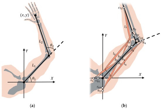 Schematic diagram of the human musculoskeletal arm model: (a) a planar kinematic model of the human arm; (b) a planar dynamic model of the human musculoskeletal arm.
