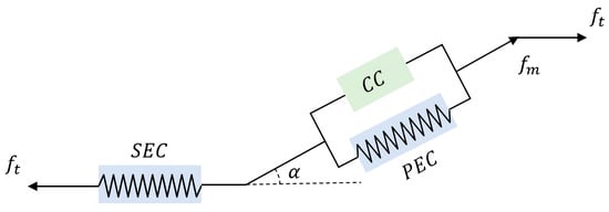 The behavior of skeletal muscles is strongly nonlinear; to model it, a Hill-based muscle modeling method is used here, which is validated for a good description of the force–velocity relation of skeletal muscle by our previous study []. The Hill-based muscle model consists of three parts: contractile, series elastic, and parallel elastic components. The contractile component (CC) is in series with the series elastic component (SEC), and both are parallel to the parallel elastic component (PEC). The arrangement of them is visualized in Figure 2.