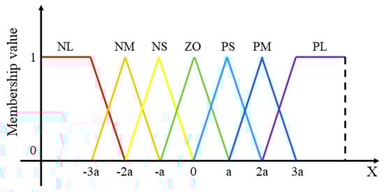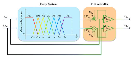 , , , and , as the input signals, are fed into the fuzzification interface, and then their own fuzzifications are obtained based on the membership function shown in Figure 3. After that, the fuzzifications of them are paired and given to the fuzzy inference engine. Then, the fuzzifications for the pairs are inferred based on the fuzzy rule base tables shown in Table 1 and Table 2. Finally, the inferred fuzzifications are transmitted into the defuzzification interface, and the update values of PD feedback gains are determined via the centroid defuzzification method.