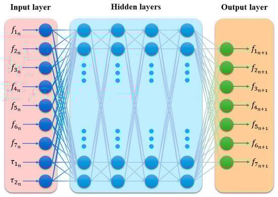 The neural networks of this controller are to imitate the real activities of skeletal muscles during arm reaching movements. In detail, the skeletal muscles are activated in an antagonistic manner, and the tensile forces generated are limited to avoid muscle strain. These neural networks consist of three layers—input layer, hidden layer, and output layer—and each of them owns many processing elements. For the input layer, the inputs are given, while for the output layer, the outputs are generated. The hidden layer is responsible for processing the data from the input layer and transmitting the processing results to the output layer. In this study, the input vector is composed of nine elements, which are the tensile forces of the seven skeletal muscles, , , …, , and the torques for the upper limb and forearm, and . Two hidden layers, here, are used to extract the deep features of the data from the input layer. There is a total of 128 neurons in the hidden layers, which are sufficient to fit the real behaviors of skeletal muscles during arm reaching movements. After the data is processed by the hidden layers, the output layer generates the suitable tensile forces for each muscle. The neural networks of the neural feedback controller are shown in Figure 5. With these neural networks, the controller can determine the suitable tensile forces for each skeletal muscle based on the torques required to drive the arm to perform reaching movements. The skeletal muscles controlled by this controller behave in a manner that is comparable to skeletal muscles really activated by the brain.
