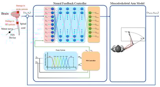 To achieve high-precision, task-specific FES rehabilitation therapy, many researchers started to investigate the mechanism of how the central nervous system (CNS) can control the human body to complete a specific motor task and tried to utilize the FES technique to generate the motion based on this mechanism. For the human arm reaching movement, Bernstein first described this movement in terms of coordinates, which served as the foundation for a qualitative and quantitative analysis of its kinematics and dynamics []. Apart from the investigation from a mathematical aspect, Morraso et al. conducted numerous experiments and the results suggest that human arm movement trajectories are planned in task-oriented coordinates rather than joint coordinates []. Specifically, human arm reaching movement trajectories from the start to the desired position are in the shape of roughly a straight path, and the speed profile of that is in the shape of a bell curve. Subsequently, investigations on the analysis of biomechanical structure, modeling, and development of motor control, etc. for the human arm were sparked. By building a model of the human arm, Uno et al. for the first time analyzed its kinematics and dynamics, providing the theoretical underpinnings for the motor control of arm reaching actions []. Based on these findings, Jagodnik et al. concluded that the feedback gains function in the brain to control joint angles and produce the required movements []. However, because the controller was based on a skeleton arm, none of them gave adequate consideration to the influence of muscles during designing the motor controller. Thomas et al. used an actor–critic architecture in the motor controller to cause the skeletal muscles to contract, causing the arm to move []. To control the movement of a musculoskeletal arm, Tahara et al. used an iterative learning approach []. A fuzzy sliding controller for this musculoskeletal arm was created by Chen et al. to conduct reaching movements []. Hausmann et al. used neural networks to simulate the sensorimotor system of the brain and create smooth trajectories that resembled the actual arm reaching action []. However, all of their designs of motor controllers stray from the fundamentals of neuroscience and are solely intended to drive the arm from one position to another. According to neuroscience studies, the many functional regions of the brain control the arm’s natural movement trajectory []. Therefore, it is crucial to develop a motor controller for FES that is neurophysiology-based, human brain-like, and has multifunctional sections. Apart from the application for FES, this kind of controller can be applied to many other fields such as the energy sector [], flight control [], vehicle technologies [], etc.