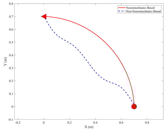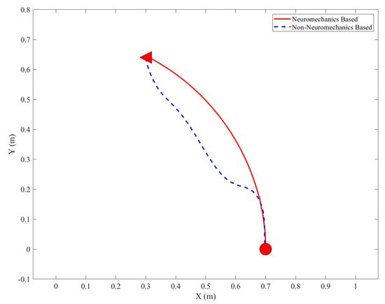 Movement trajectories (start from (0.7,0) and end at (0.3,0.65)) generated by the musculoskeletal arm under neuromechanics—based and non—neuromechanics—based neural feedback controllers.