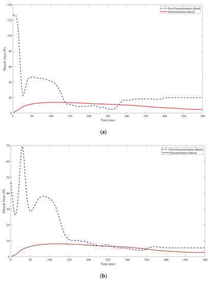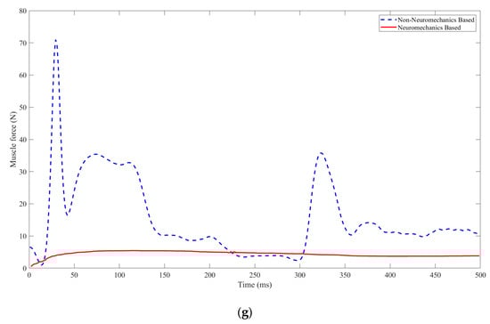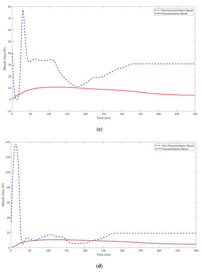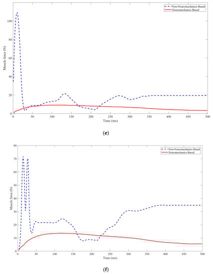 Furthermore, to ensure that the designed neural feedback controller can move the arm from one position to another target position, a new target position is set as , , and other parameters are left unchanged. Figure 7 and Figure 8 depict the trajectories of the musculoskeletal arm under the influence of two distinct neural feedback controllers. The results of the comparison between the most important parameter indicators for the reaching movements under these two controllers have been presented in Table 6 and Table 7, respectively. According to the results of the simulation, the neuromechanics-based neural feedback controller can move the human arm to the target position with a bell-shaped trajectory that closely resembles the actual movement trajectory of the human arm, whereas the non-neuromechanics-based neural feedback controller is unable to do so. Based on the findings presented in Figure 9, it is evident that the neuromechanics-based neural feedback controller successfully maintains the tensile forces of each skeletal muscle below the maximum permissible threshold. Notably, the values of these forces exhibit greater stability when regulated by the neuromechanics-based neural feedback controller compared to the non-neuromechanics-based neural feedback controller.