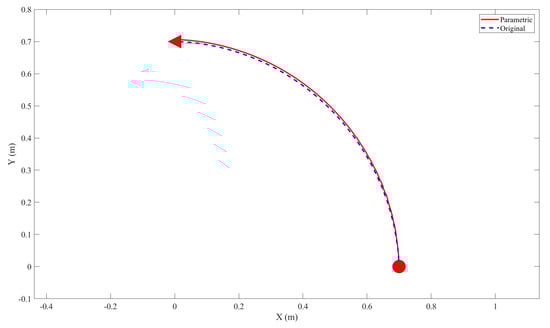 As each patient has unique physiological properties, it is crucial for the neural feedback controller to perform well even when the parameters of the musculoskeletal arm are altered. Hence, this section examines the robustness of the controller to confirm its applicability to different patients. For the robustness test, a 15% uncertainty is added to all the parameters of the musculoskeletal arm, while the motion task remains unchanged. The start position, target position, and maximum tensile force limit for each muscle remain the same. The movement trajectories under the neural feedback controllers with different parameters are depicted in Figure 10, and the comparisons between these two trajectories are listed in Table 9. The difference between the two trajectories is measured by the maximum difference on the x and y axis, which is found to be less than 10% from the experimental results, demonstrating acceptable performance.