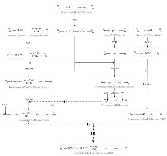Detailed information of strains and plasmids used in this study is summarized in Table 1. Three genes of key enzymes (pct, propionate CoA-transferase; mcr (1–549), N-terminal of malonyl-CoA reductase; mcr (550–1219), C-terminal of malonyl-CoA reductase; acc ADBC, ATP-dependent acyl-CoA synthetase) were cloned from donor plasmids into backbone vector pBBR1MCS-2 by several steps (Figure 1); in addition, the arabinose operon (ara C-PBAD) was cloned from E. coli BL21 genome into backbone vector to gain the final expression vector pBBR-ara-pct-mcr-acc ADBC. The detailed cloning process is summarized in Figure 1 and the primer information is summarized in Table 2.