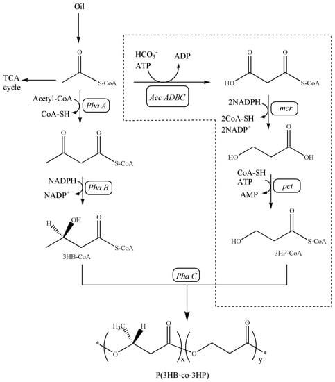 As indicated by a recent study [], other candidate strategies should be tested to further improve the 3HP molar fraction in P(3HB-co-3HP): (1) the supplementation of cysteine (increase CoA supply); (2) the suppression of the 3HB pathway (by interrupting genes towards 3HB-CoA biosynthesis); (3) and the utilization of 3HP favored PHA synthases.