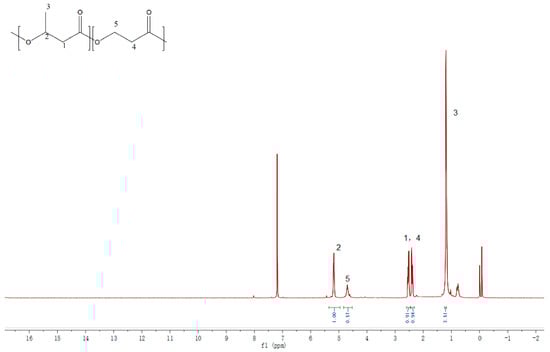 1H NMR spectrum of P(3HB−co−3HP) synthesized by C. necator ZL1. The representative resonance of the C5 methylene group in the 3HP monomer was detected at 4.70 ppm, confirming that the 3HP unit was polymerized to produce P(3HB-co-3HP). The resonance of the C4 methylene group in the 3HP unit (2.40 ppm) was detected near the resonance of the C1 methylene group in 3HB (2.50 ppm).