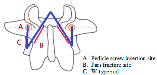 Bilateral pars fractures with pedicle screw W-type rod fixation. Note: red line indicates the fracture site; and blue line indicates the shape of the W-type rod.