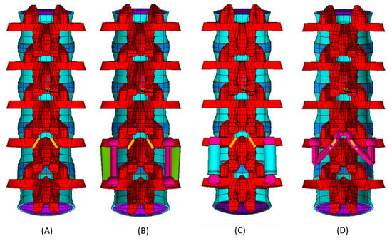 The Dynesys model simulated a lumbar spine with spondylolysis and spinal instrumentation. The study modeled bilateral pars fractures at the L4 and fused L4–L5 motion segments. We constructed four titanium alloy pedicle screws (Φ = 6 mm, L = 44 mm), two polycarbonate urethane (PCU) spacers (outer Φ = 12 mm, inner Φ = 9 mm, L = 30 mm), and two polyethylene terephthalate (PET) cords (outer Φ = 7 mm, inner Φ = 6 mm, L = 10 mm) and applied them to a fused L4–L5 motion segment in the Bipars model. Subsequently, we applied 300 N of elasticity pretension on the cords; this model was named “Bipars_Dyn.”. The material parameters of the model (Figure 3C) are displayed in Table 1. The Bipars_Dyn model included 158,540 elements and 101,791 nodes.